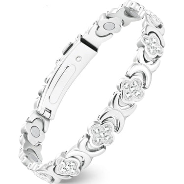 Each link features a delicately shaped four-leaf clover, symbolizing luck, love, and prosperity. The inner side of the bracelet is embedded with 3,800 gauss healing magnets, designed to help improve circulation, reduce fatigue, and restore natural balance.